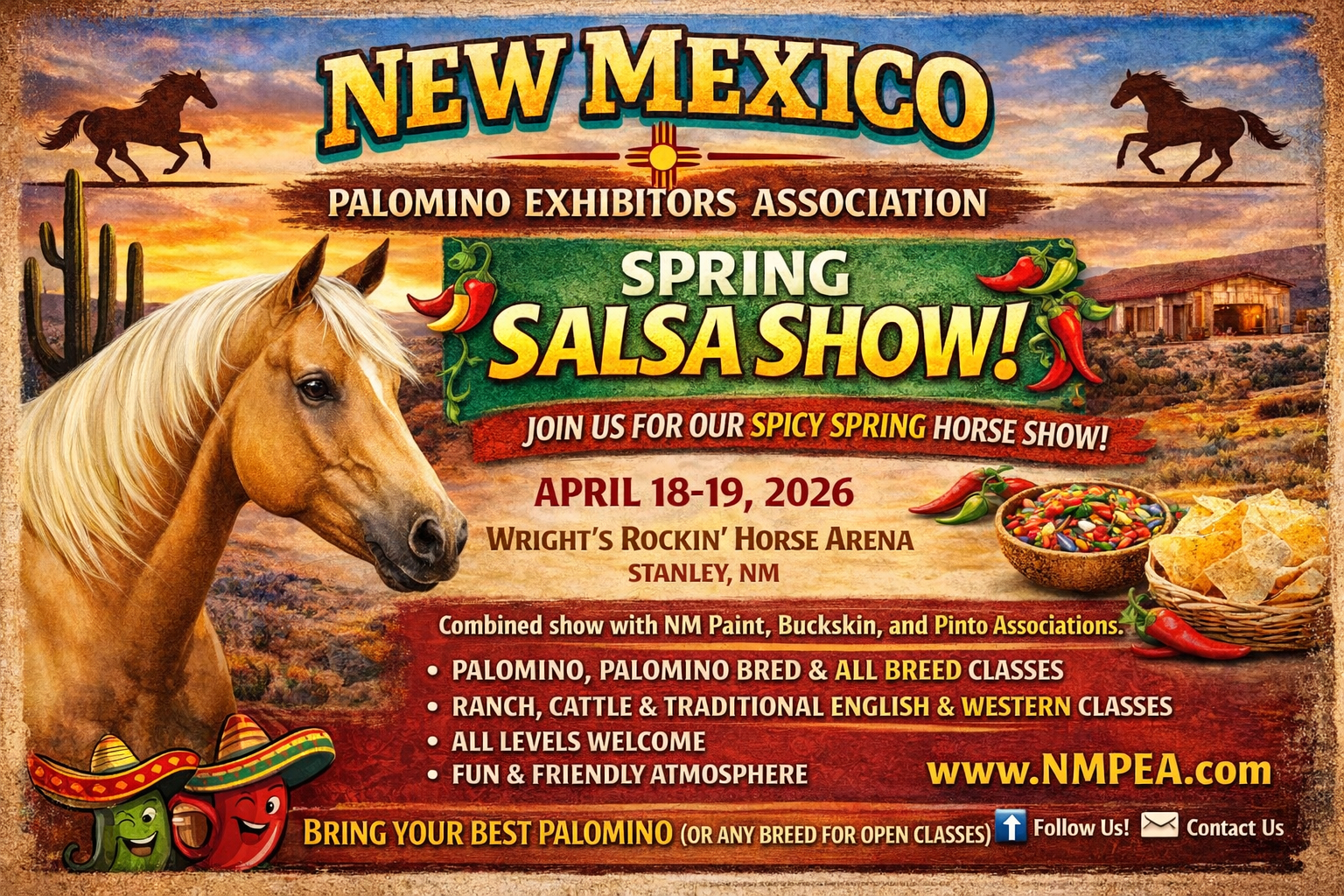 Spring Salsa Sensation, April 18-19, Wright's Rockin' Horse Arena, Stanley, NM. Double judged. Palomino, Paint, Pinto, Buckskin and All Breed Show. The link to the Spring Salsa will take you to the Spring Salsa Sensation Show webpage on the NM Paint Horse Club website*. Spring Salsa NMPHC is our host and partner for this show. You will find class lists for each breed as well as the master class list, show rules, entry forms and more on that page as quickly as information becomes available.